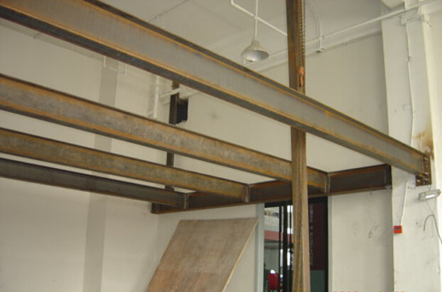 主梁在夾層工程中是安全關鍵之二,如果一顆樹根基再好而樹干不能承受外力也是枉然,主梁的選擇和屋面的承載,跨度是有直接關系的,如果跨度小就可以選用工字鋼,或H型鋼,鋼梁選好后要進行打磨除銹,切割,底漆等處理,到現場后測量兩端錨固在進行細切,夾層工程和其他鋼構工程不同,多數梁檁的長度都是不定長度的,所以實測后在切割,如果跨度小就盡量選用型鋼,因為箱型梁必須焊接,造價高,重量大,吊裝運輸困難.